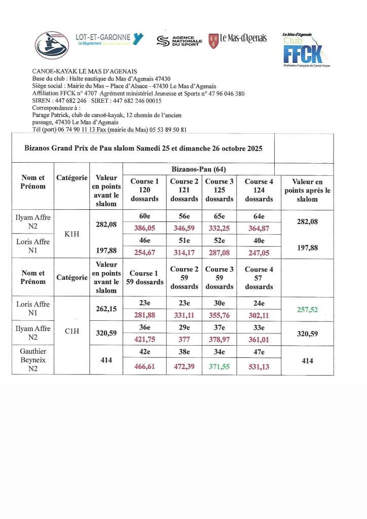 Le club du Mas sera représenté au grand prix de Pau en slalom ce week-end samedi 25 et dimanche 26 octobre par :-